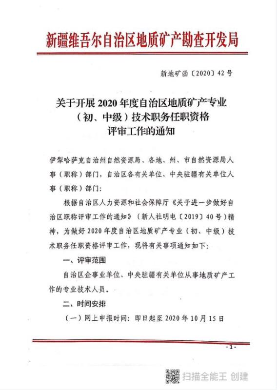 >关于开展2020年度自治区地质矿产专业(初、中级)技术职务任职资格评审工作的通知